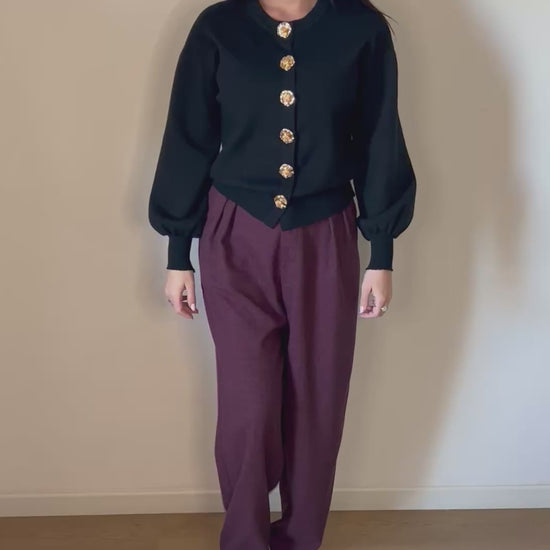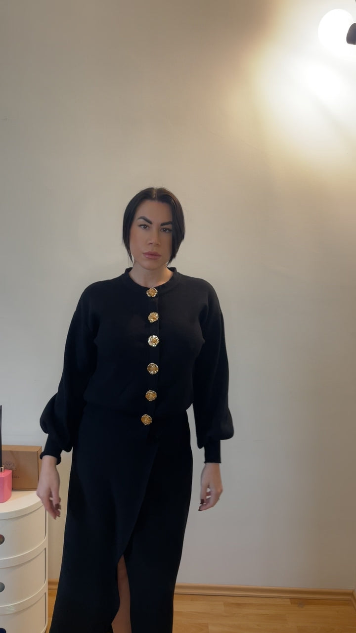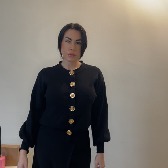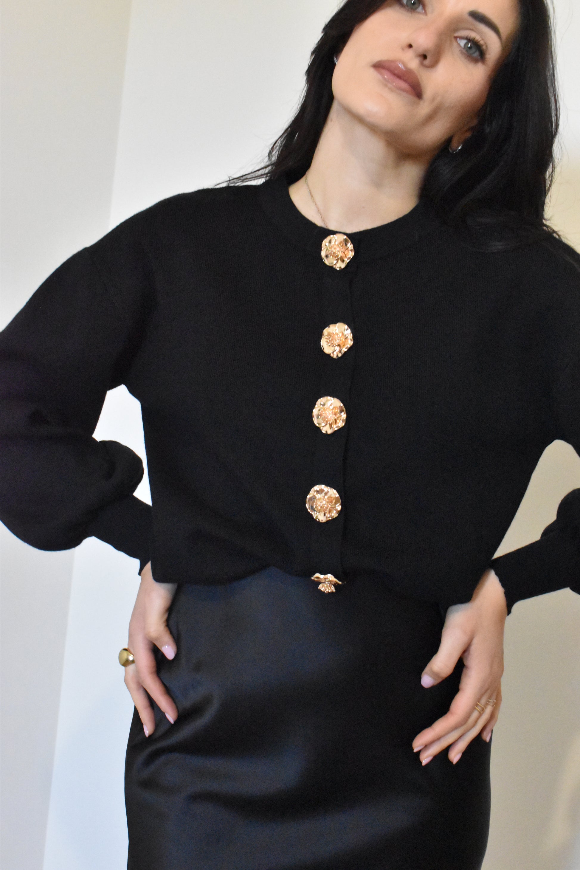 Cardigan con bottoni gioiello dorati con lavorazione floreale. Realizzato in maglia morbida e leggera, offre vestibilità comoda e versatile.