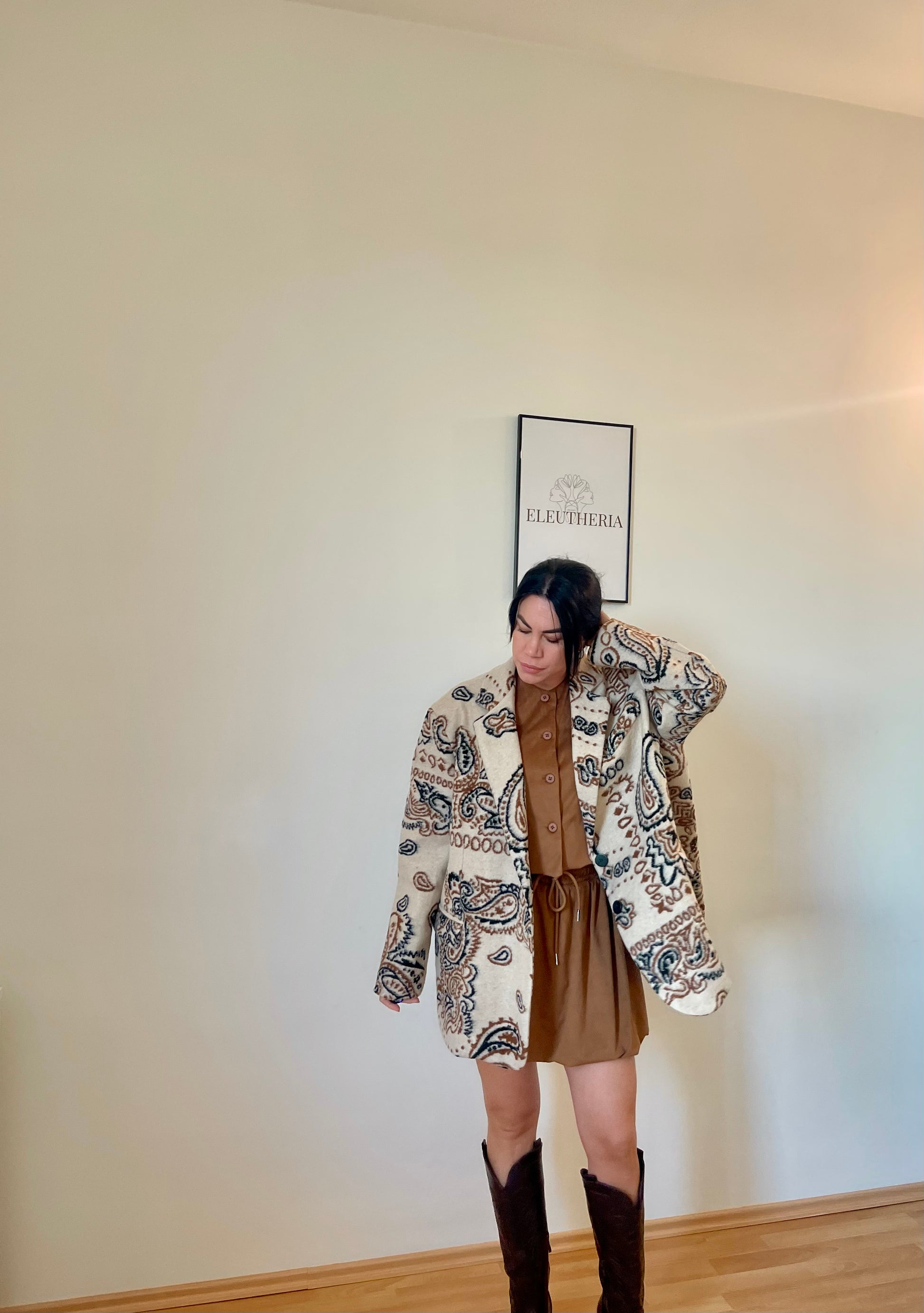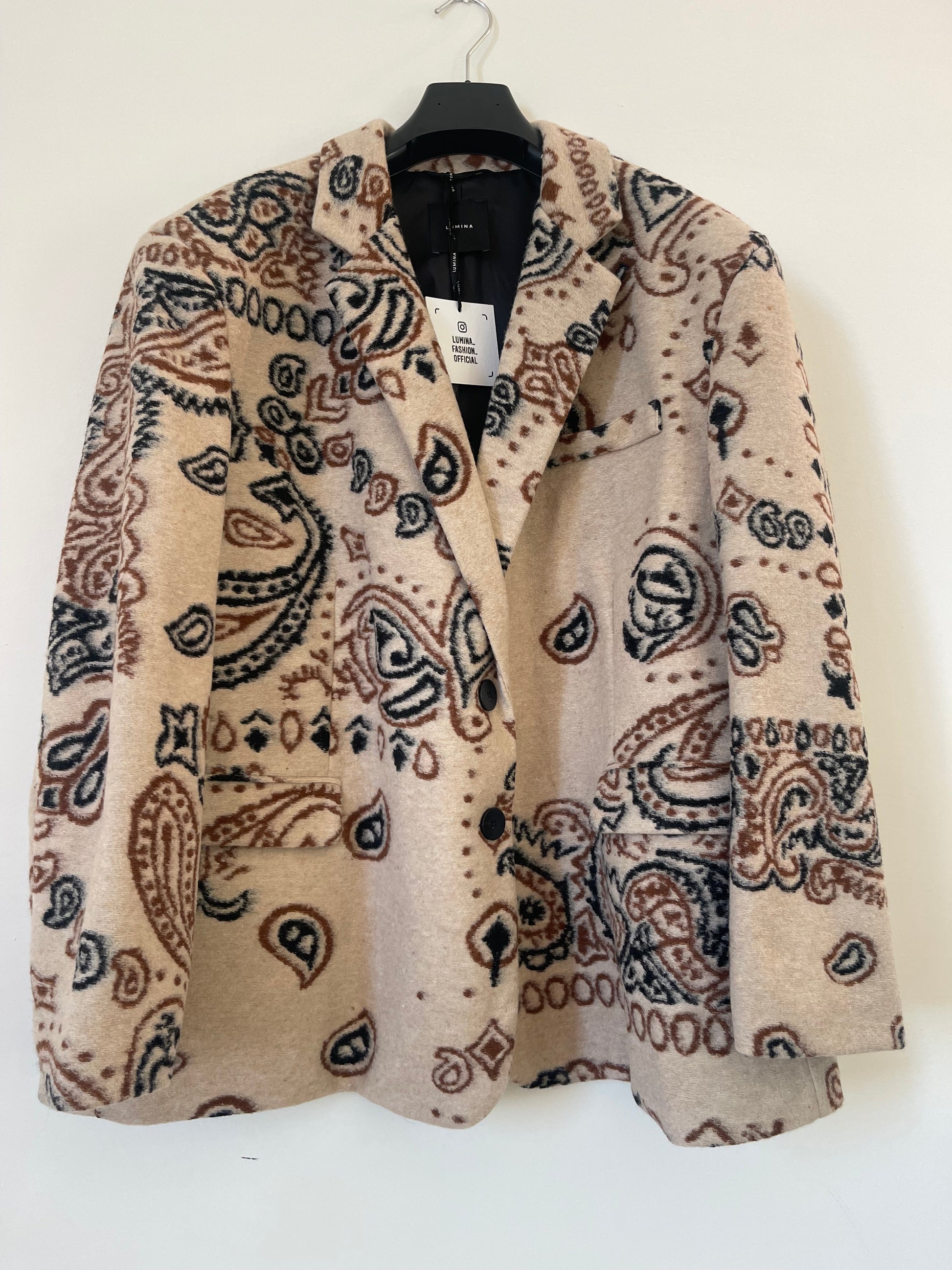 Eleva il tuo stile con questa giacca oversize dal fascino ricercato e bohèmien. Presenta una stampa paisley nei toni caldi del panna e del marrone che donano profondità al capo. Grazie al suo taglio oversize, si adatta a ogni silhouette ed è un must-have per la tua collezione autunnale. In lana rasata con collo a revers, maniche lunghe e spalline imbottite. Chiusura frontale con bottoni.