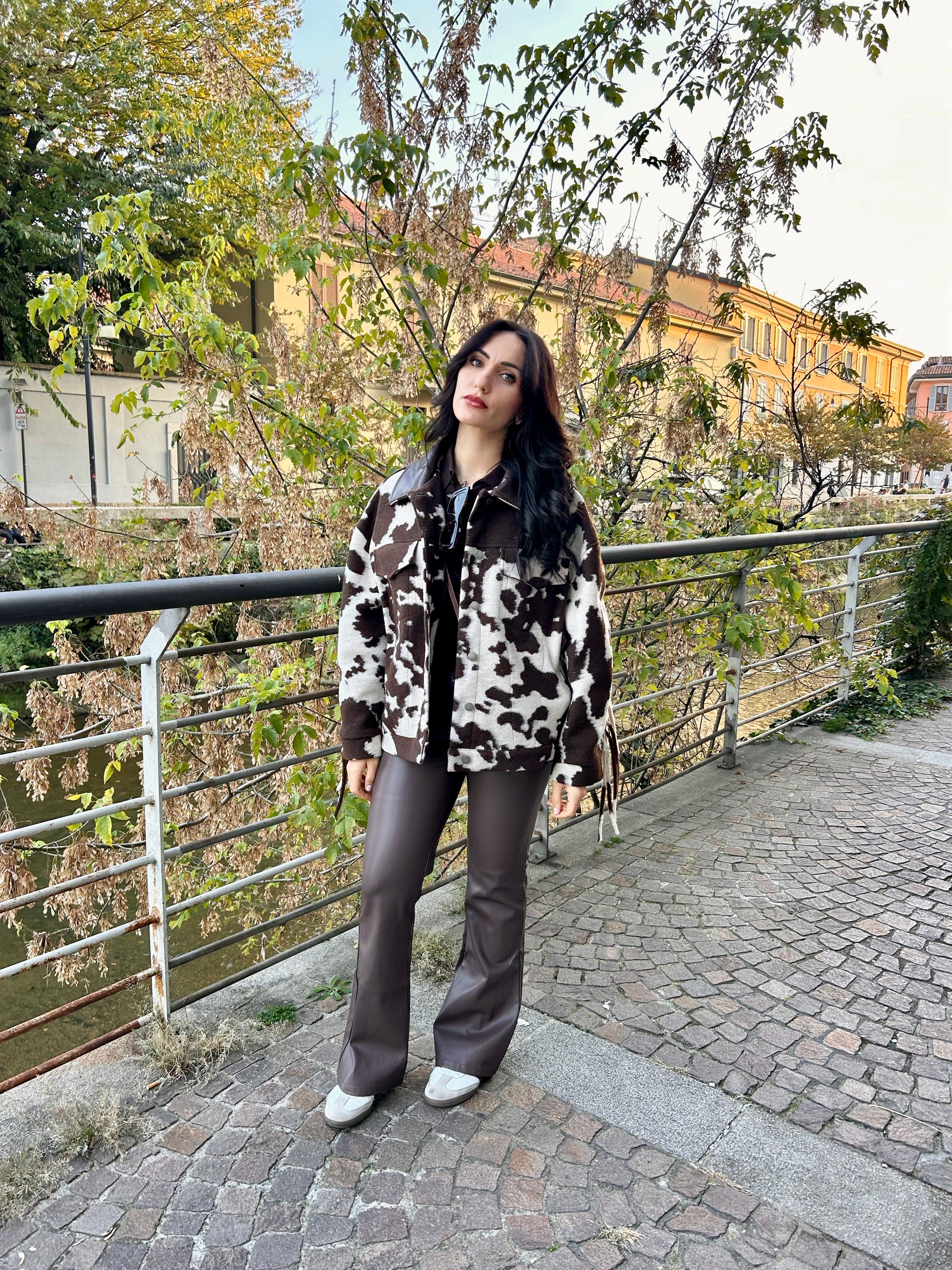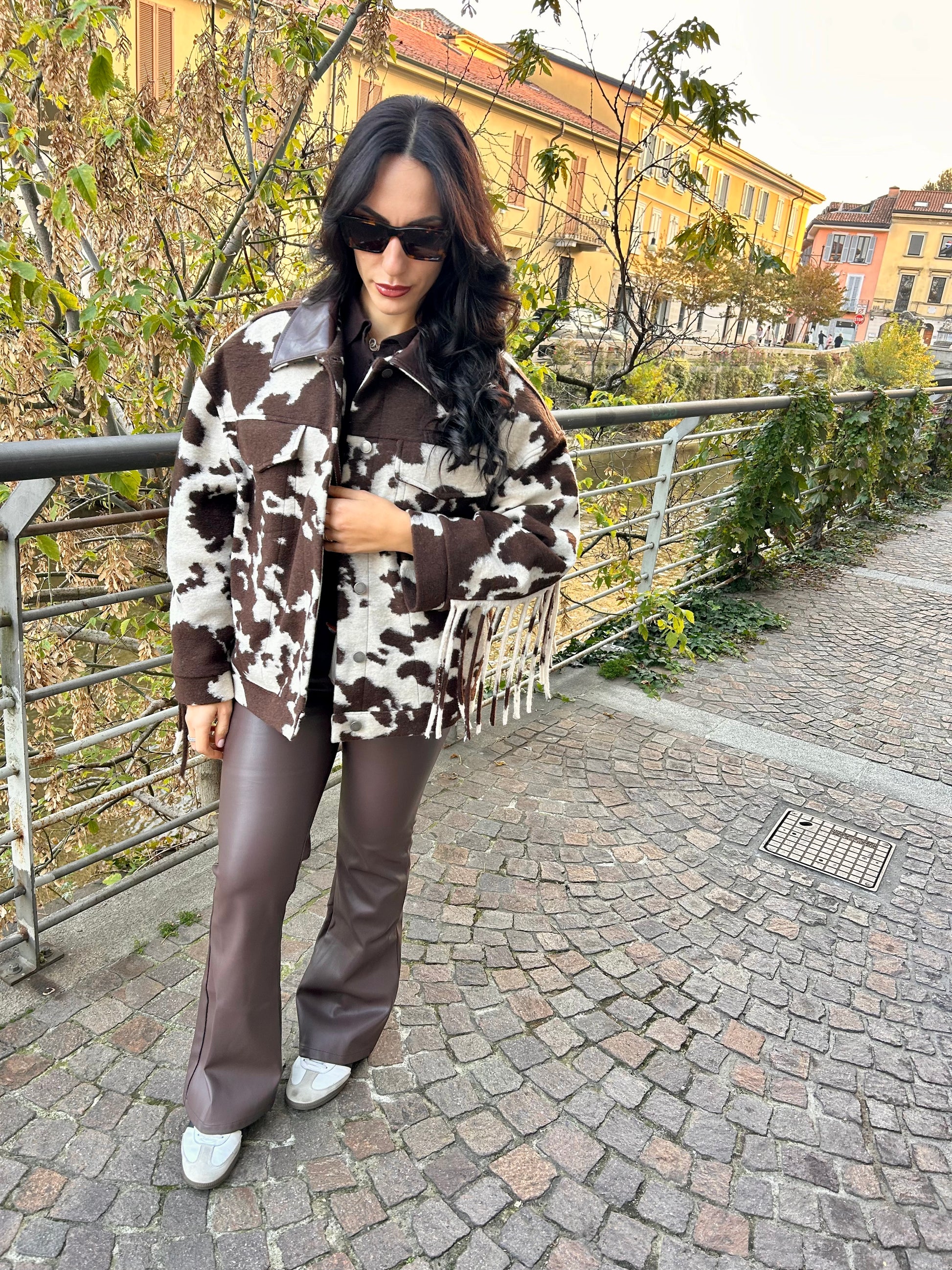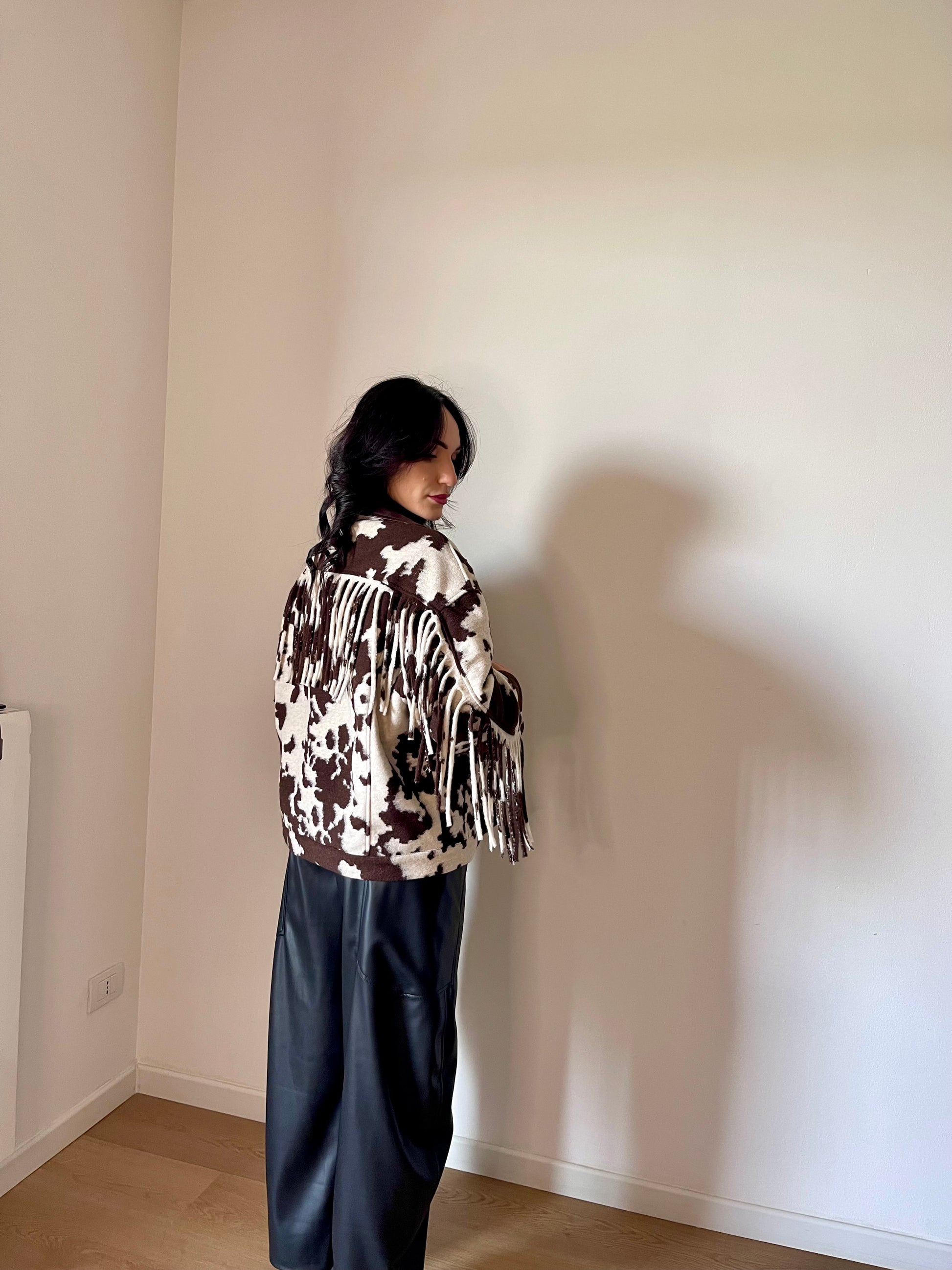Un capo perfetto per la transizione tra le stagioni che unisce comfort e audacia. Questa giacca muccata nei toni caldi del marrone e del bianco panna è rifinita dal dettaglio delle frange che aggiungono un tocco dinamico, rendendola ideale per chi ama gli accessori di carattere. Chiusura frontale con i bottoni e collo a revers a contrasto.