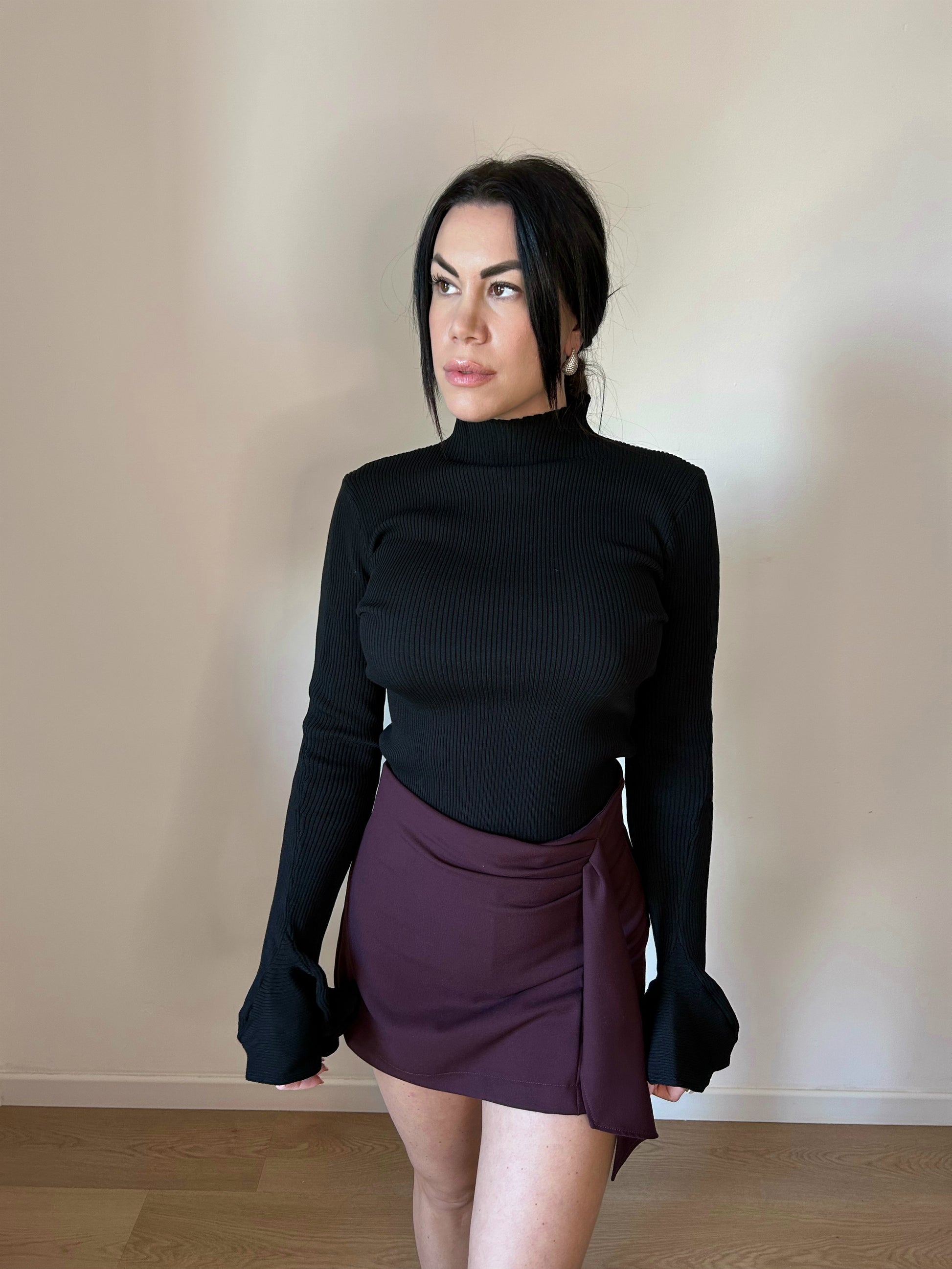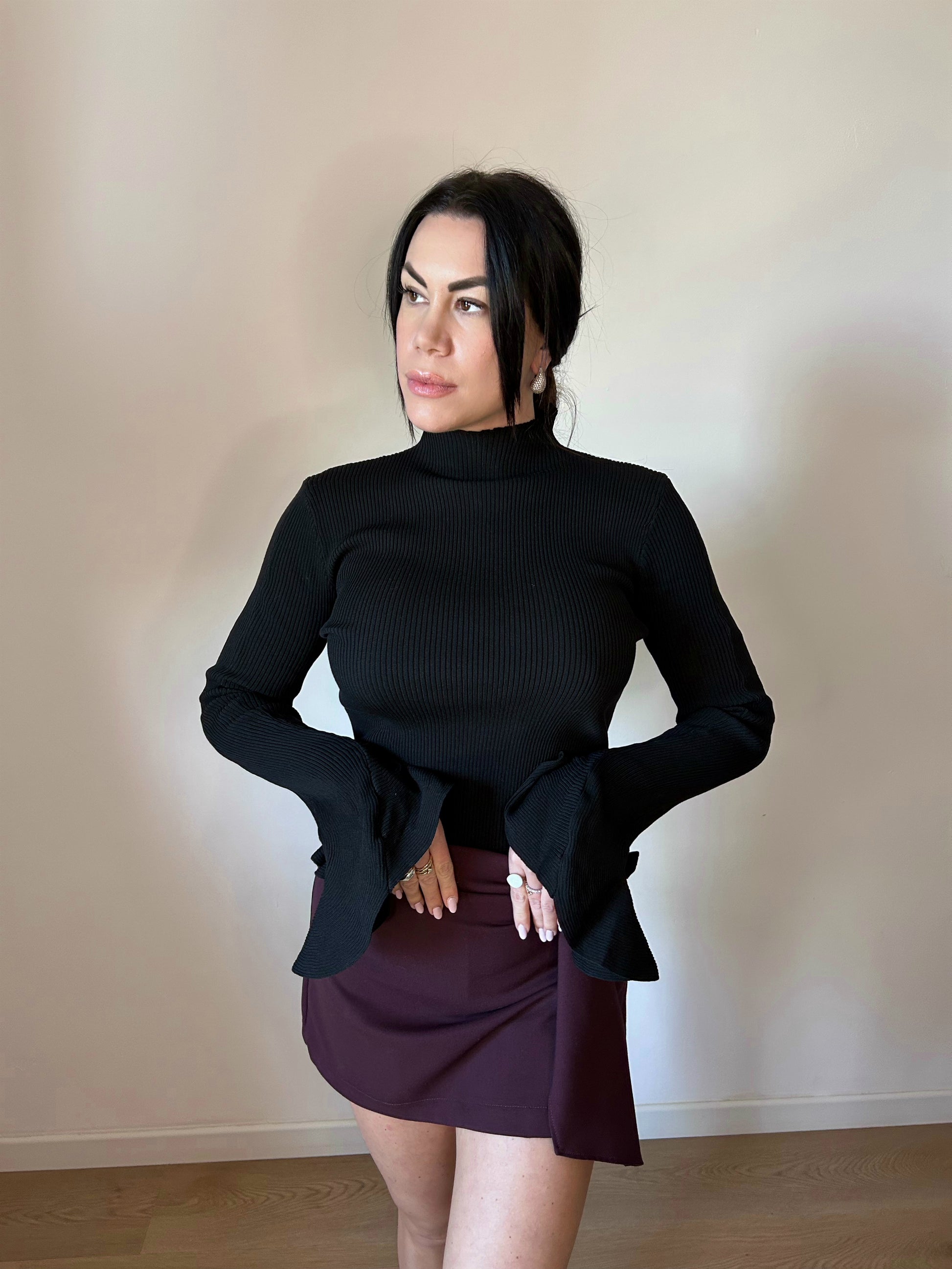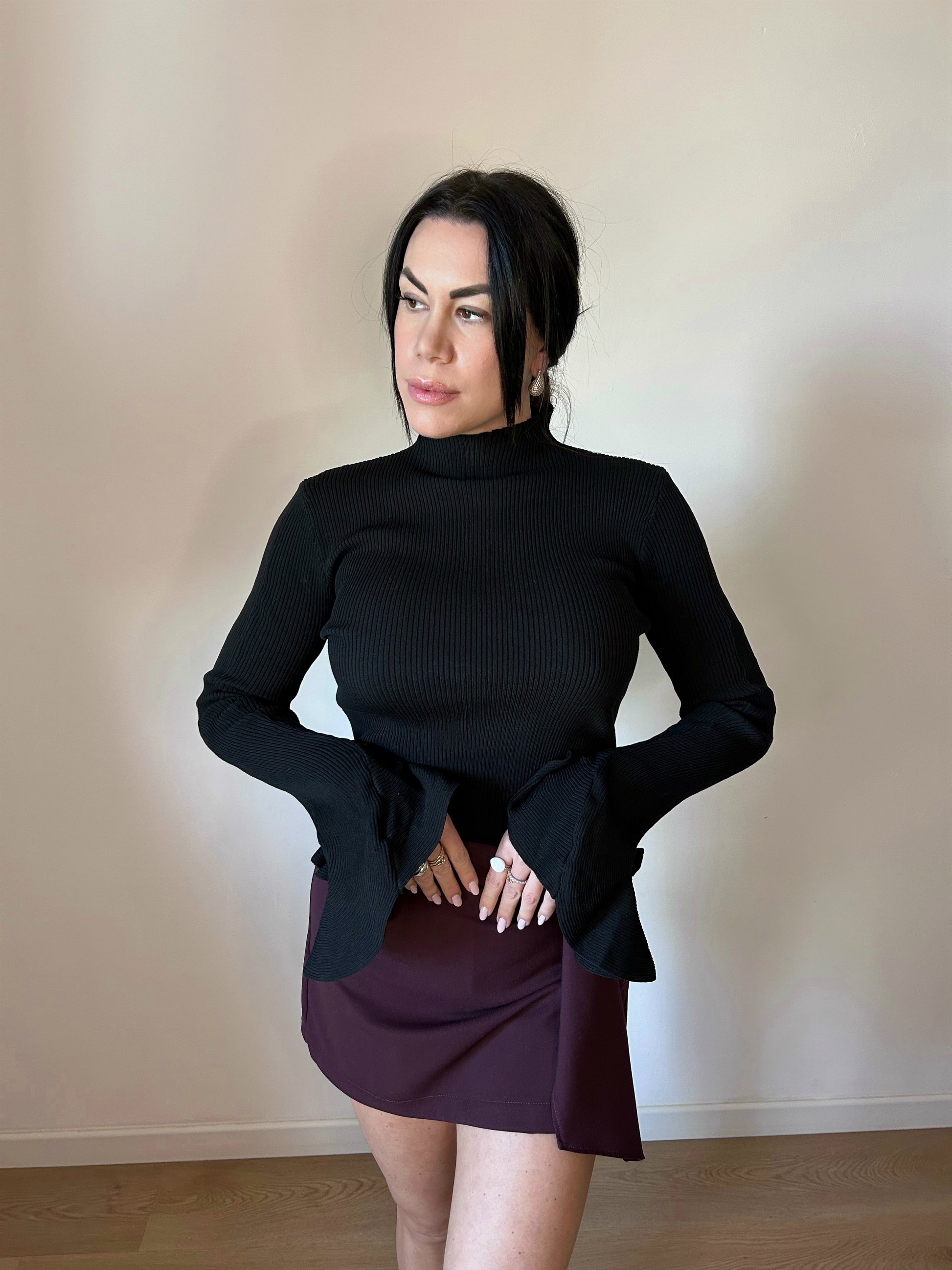 Maglia a maniche lunghe, collo alto e tessuto a costine elasticizzato. Maniche a campana svasate. Perfetta come sotto giacca o per un look sofisticato.