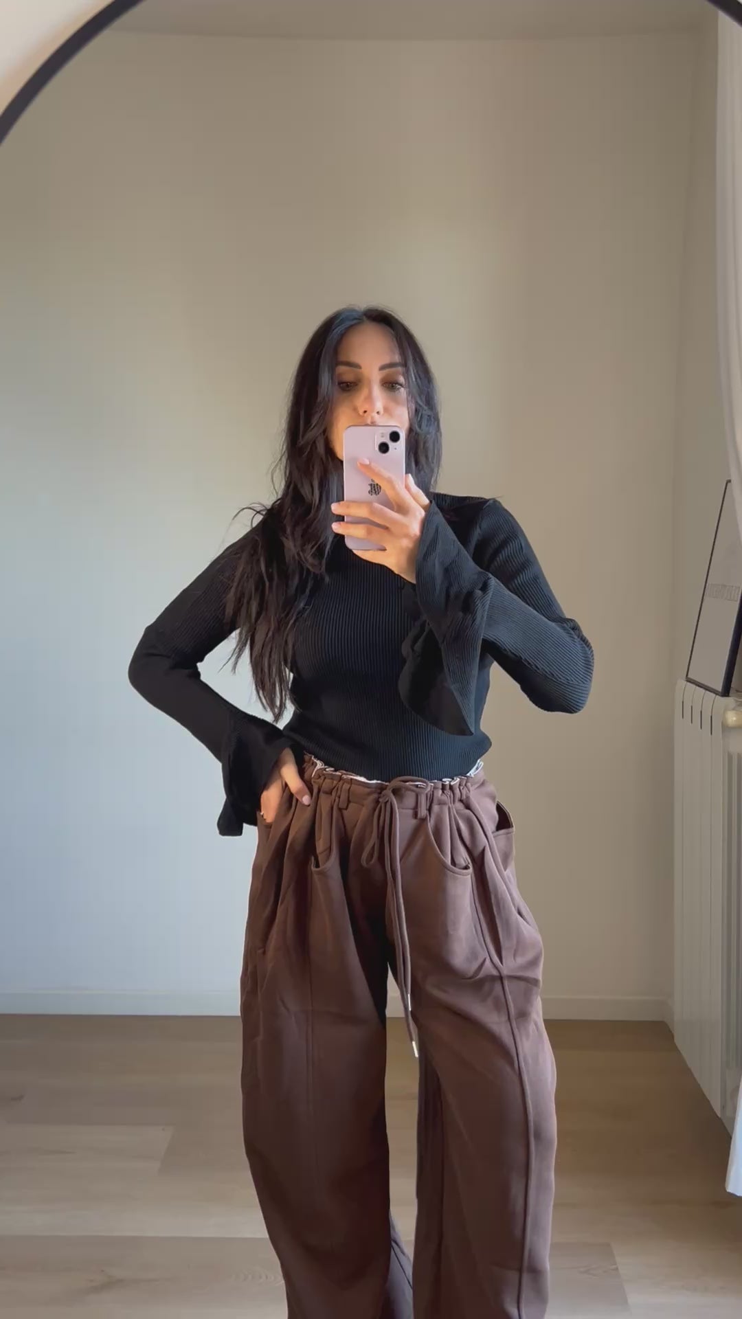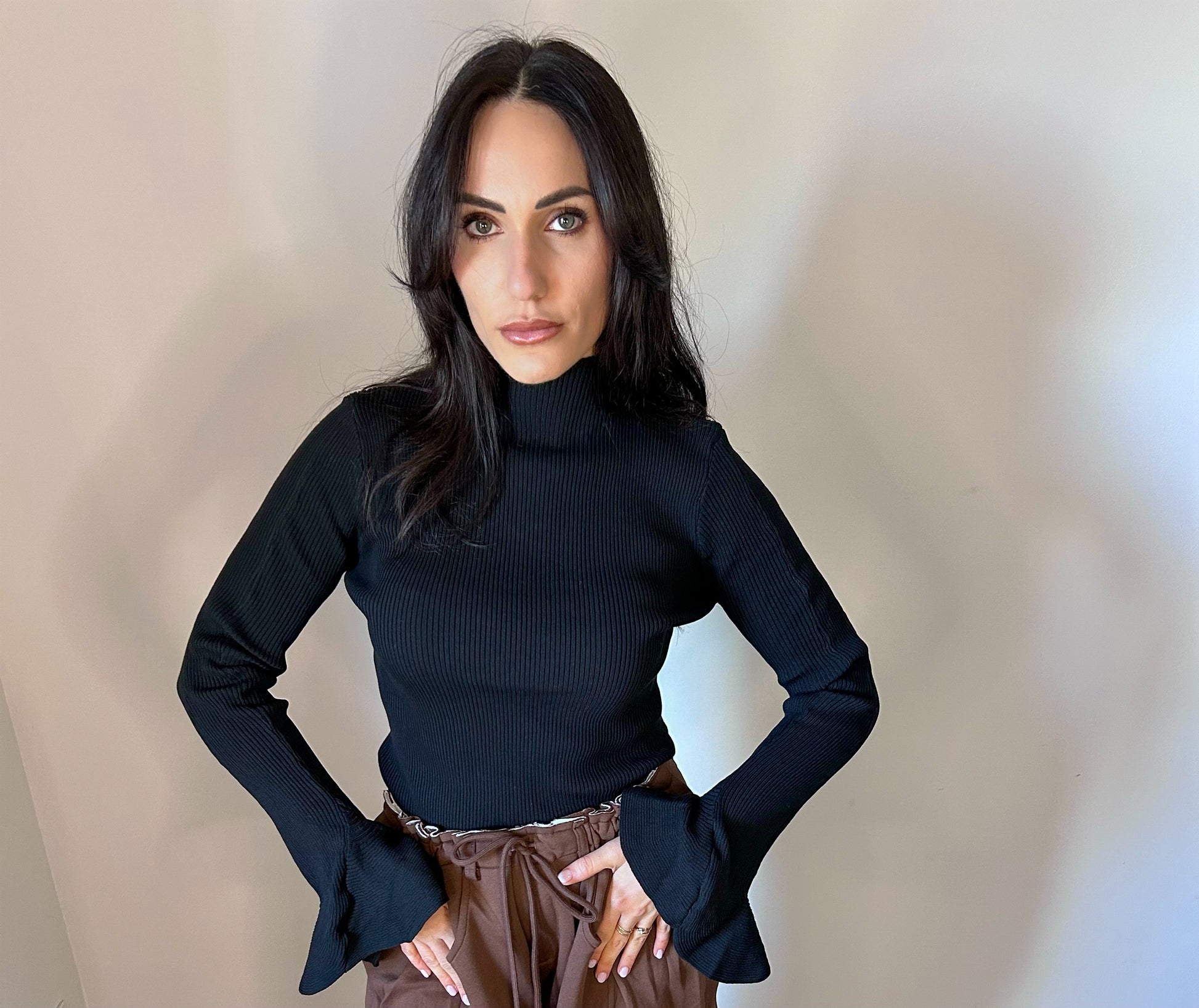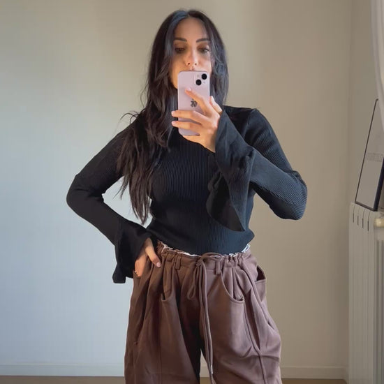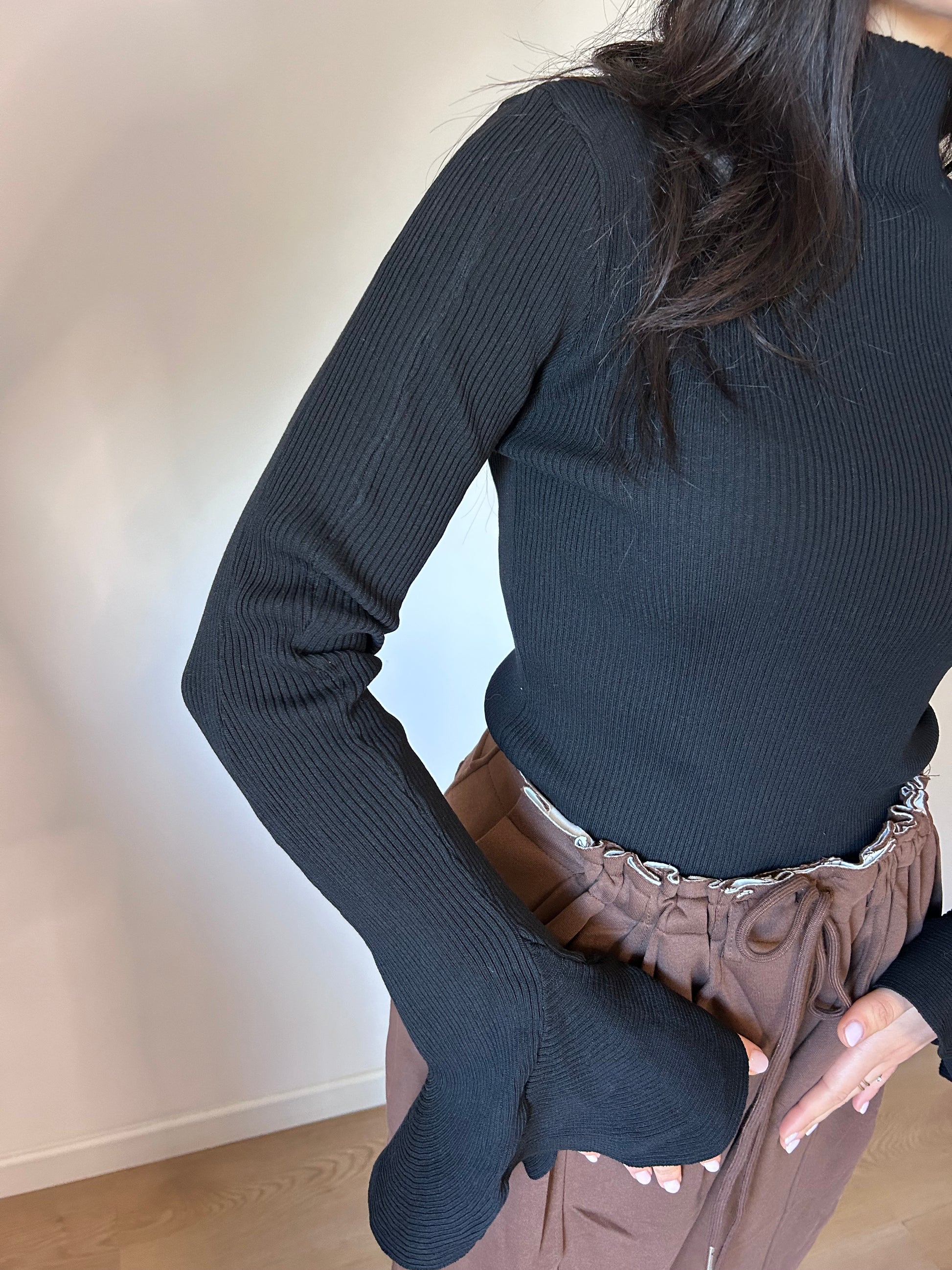 Maglia a maniche lunghe, collo alto e tessuto a costine elasticizzato. Maniche a campana svasate. Perfetta come sotto giacca o per un look sofisticato.