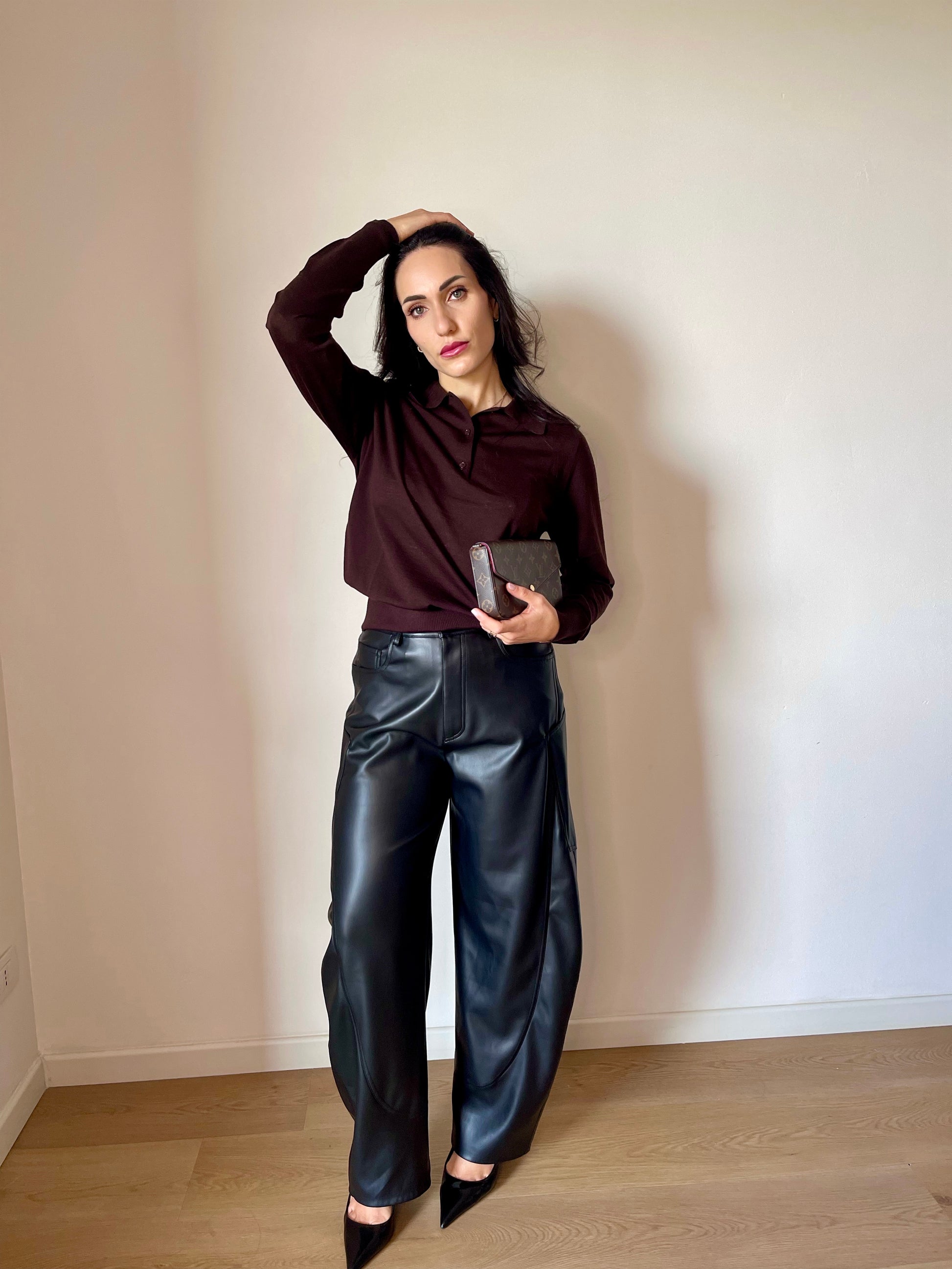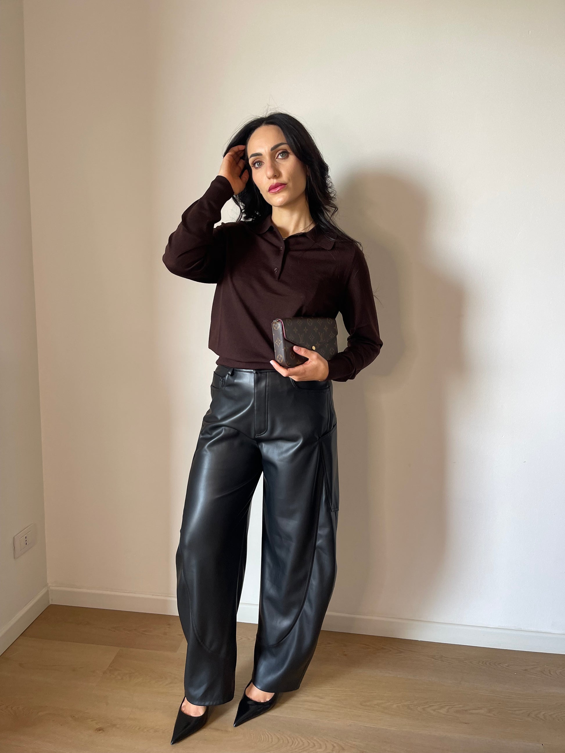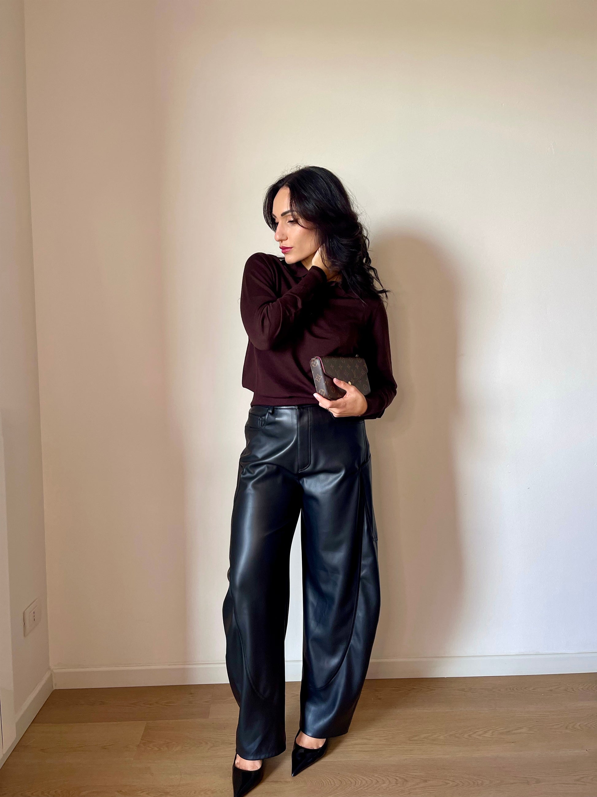 Pantaloni barrel con dettaglio tasche cargo laterali. Realizzati in morbida ecopelle nera con una finitura lucida che dona un tocco rock e sofisticato. L’alternativa alla pelle vera, per uno stile etico e d’impatto.