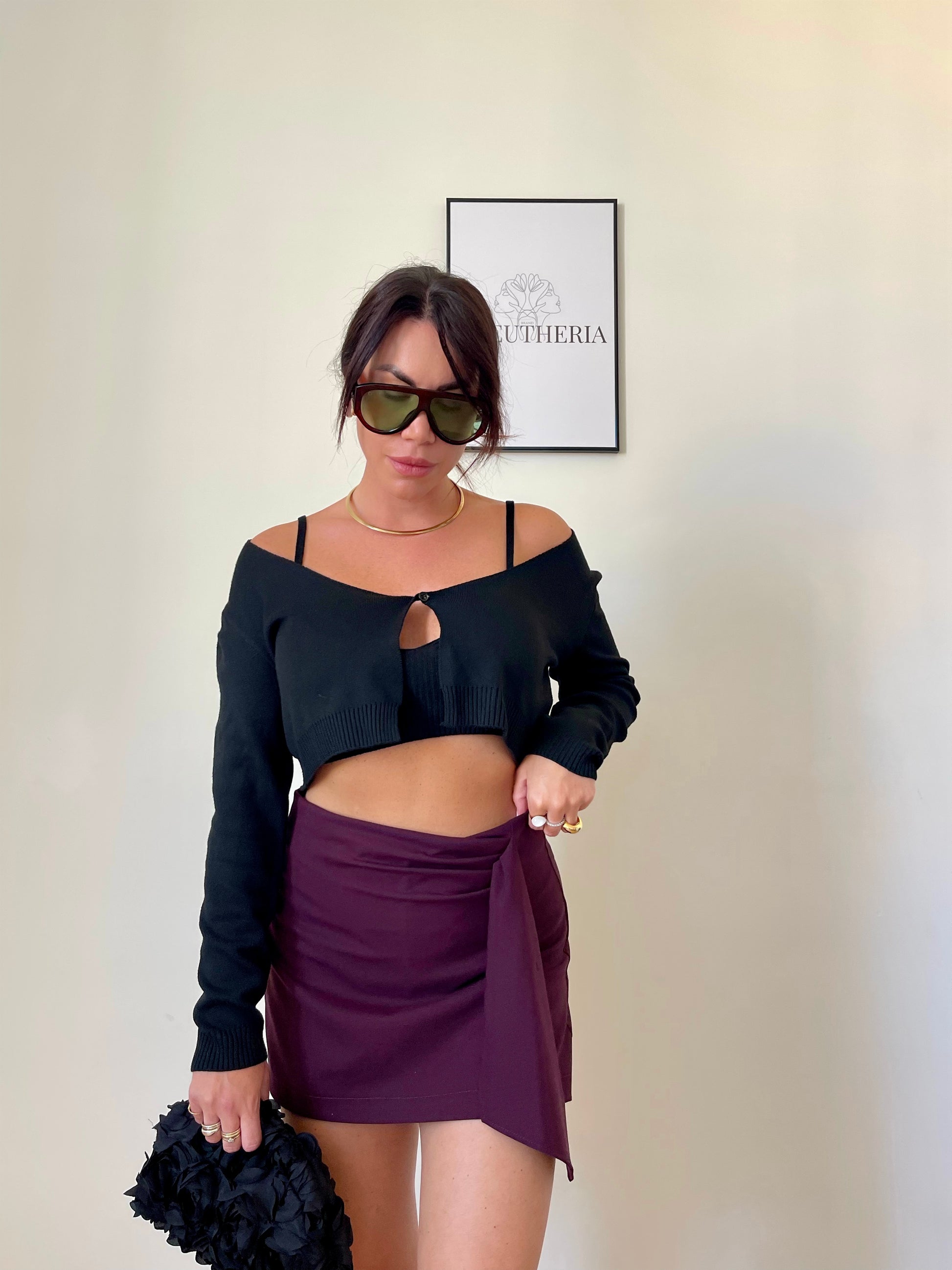Set 2 pezzi crop in maglia nero: cardigan con scollo a V regolabile e drop top essenziale a costine. Insieme per un look sofisticato o separatamente per infinite combinazioni.