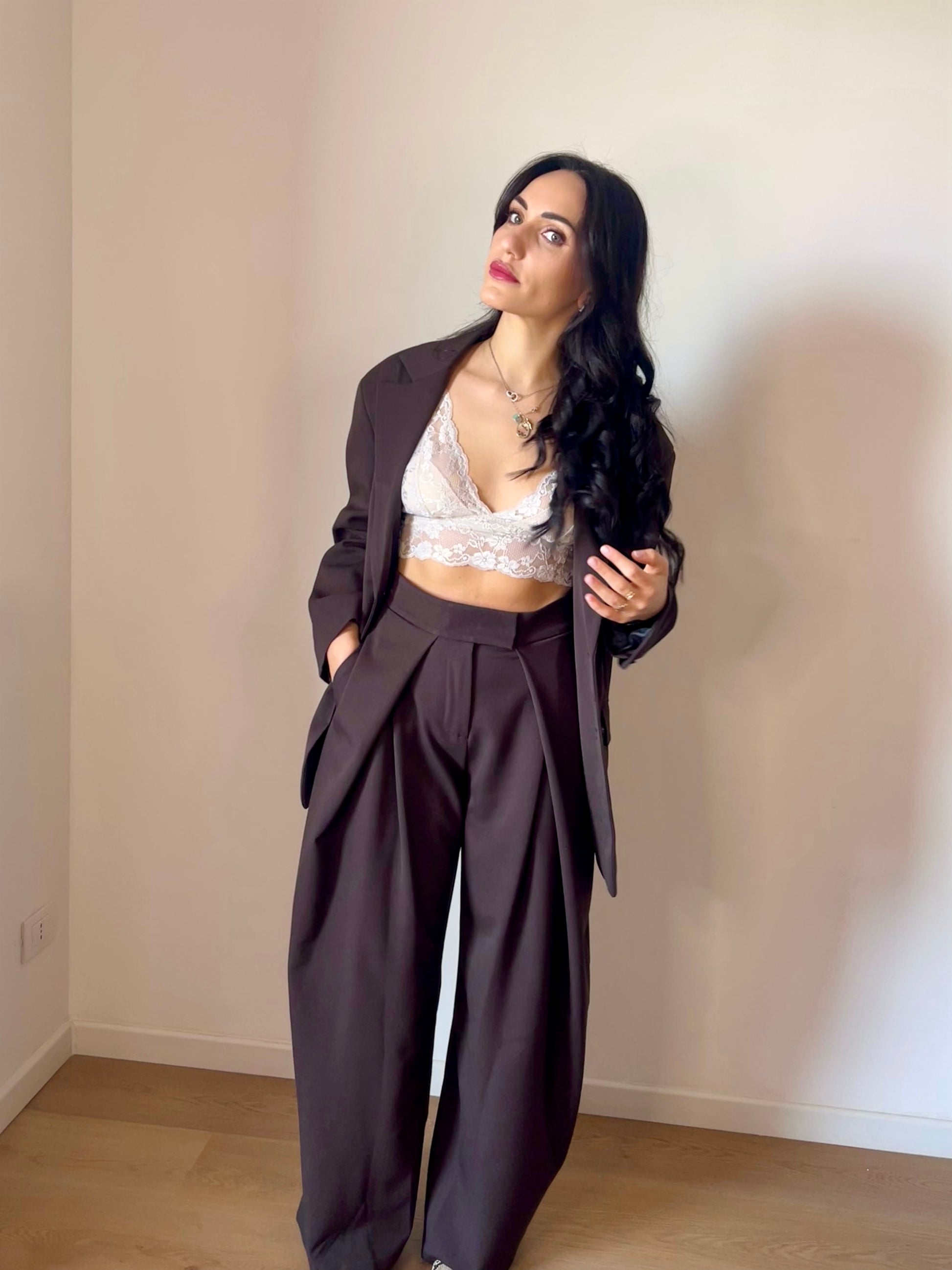 Vestibilità: oversize. La modella indossa la taglia M per i pantaloni e TAGLIA UNICA per il blazer.